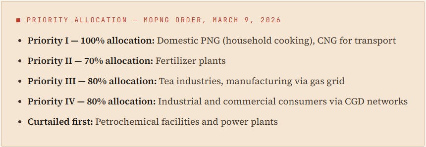 What followed was essentially a domino chain. With LNG supply constrained, India’s oil marketing companies faced a domestic LPG supply crunch. The Ministry of Petroleum and Natural Gas moved fast, on March 9, it issued the Natural Gas (Supply Regulation) Order, 2026, which set a strict priority framework for who gets gas and how much.