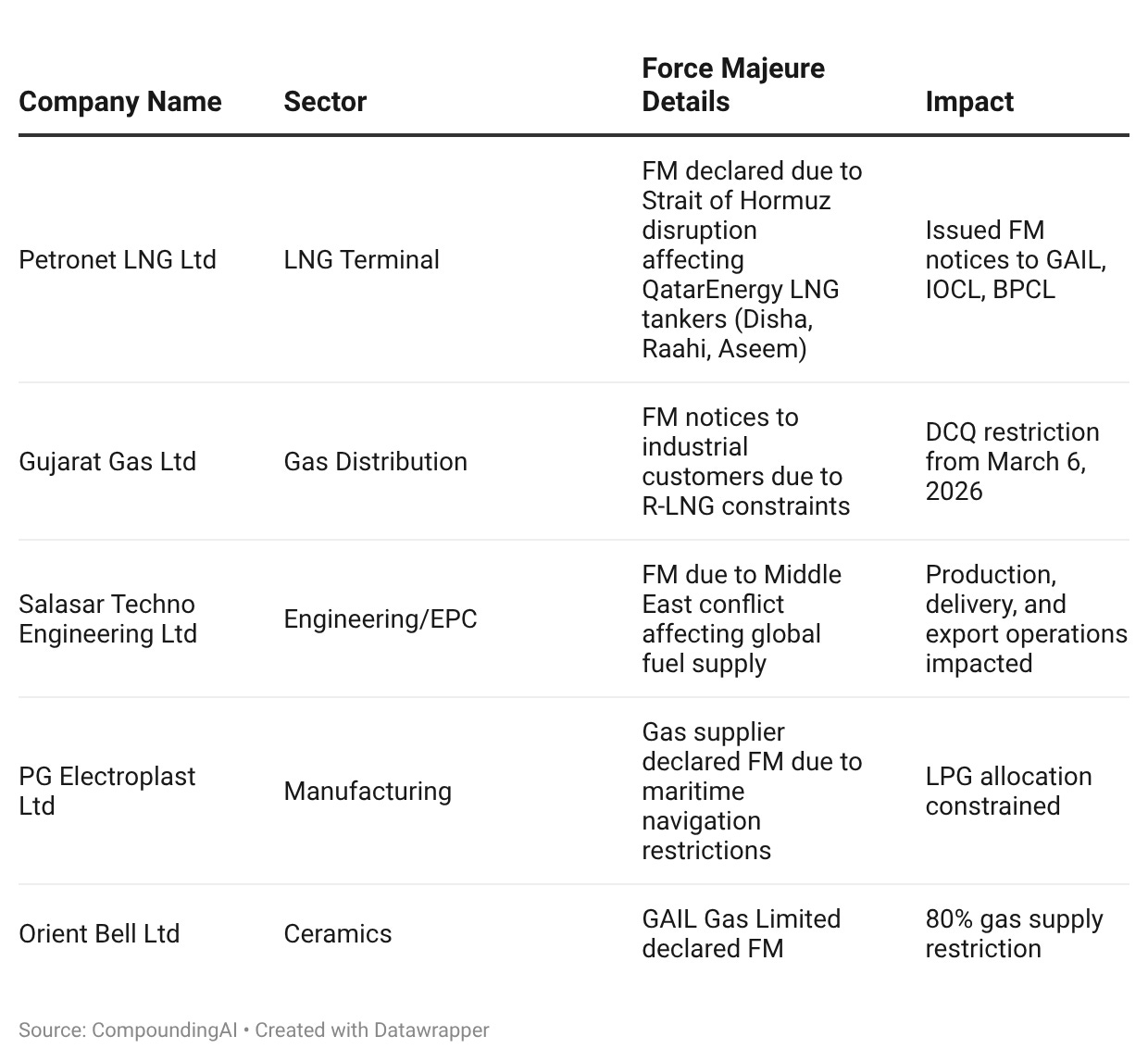 Between March 3 and March 17, 2026, 30+ publicly listed Indian companies filed disclosures acknowledging operational disruptions tied to LPG, LNG, and petrochemical feedstock shortages linked to the conflict. Some of those disclosures were four sentences long. A few were specific about operational timelines. Most used the standard regulatory language of force majeure and estimated impact disclaimers.