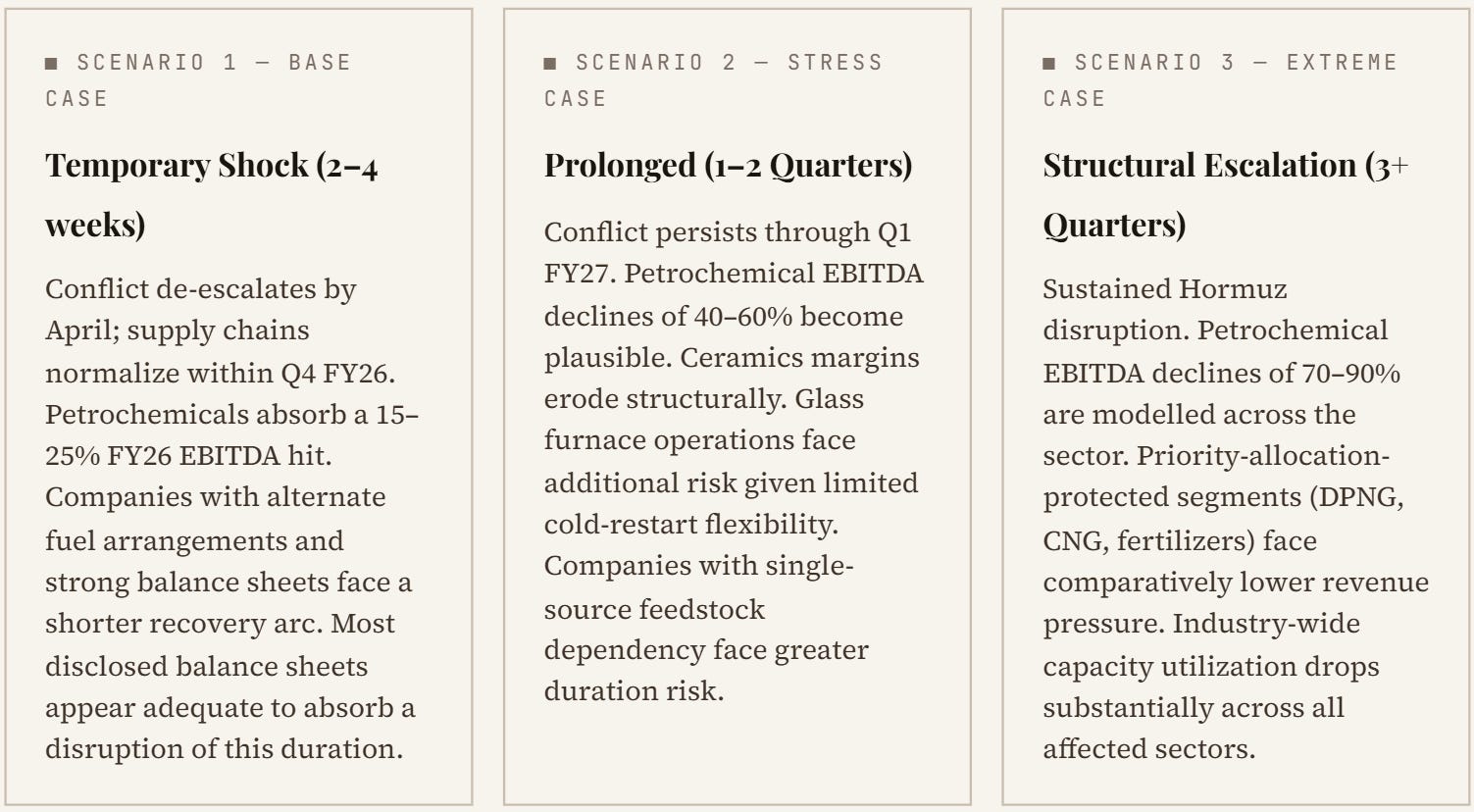 | Scenario 2 - Stress Case | Prolonged (1–2 Quarters) | Conflict persists through Q1 FY27. | Petrochemical EBITDA declines of 40–60% plausible. Ceramics margins erode; Glass faces cold-restart risks. Single-source feedstock users face high risk. |