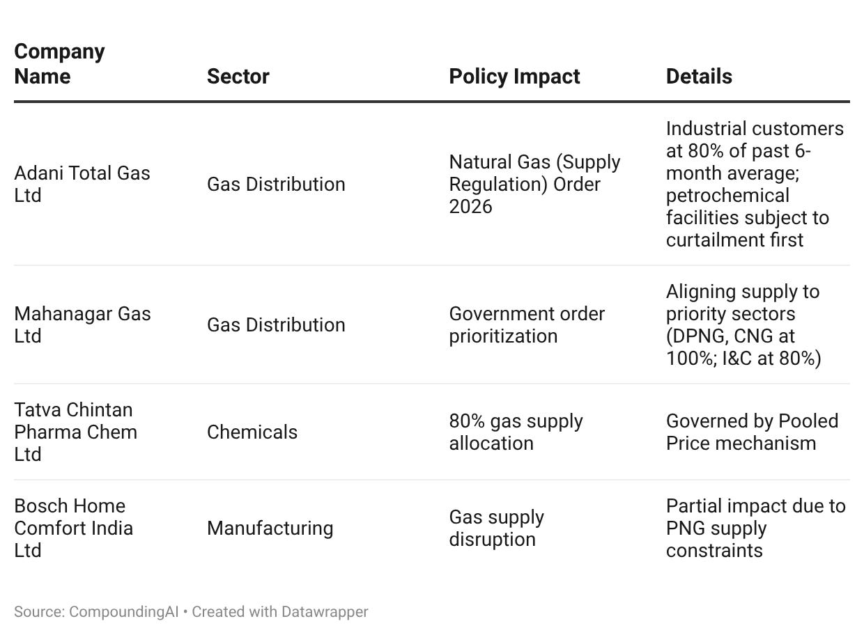 | Adani Total Gas Ltd | Gas Distribution | Natural Gas (Supply Regulation) Order 2026 | Industrial customers at 80% of past 6-month average; petrochemical facilities subject to curtailment first |