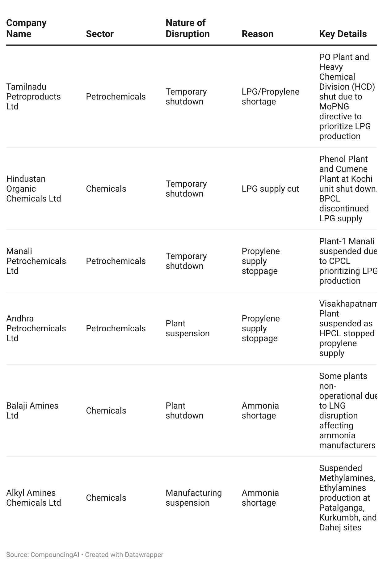The first bucket is the hardest hit: petrochemical and amine manufacturers who use LPG or propylene not as fuel but as their core raw material. For them, this it was a production stoppage. Tamilnadu Petroproducts shut its PO Plant and Heavy Chemical Division. HOCL shut its Phenol and Cumene plants. Manali Petrochemicals suspended Plant-1. Andhra Petrochemicals suspended its entire Visakhapatnam facility. Balaji Amines and Alkyl Amines suspended methylamine and ethylamine production across multiple sites. These are complete shutdowns, not rationalisations.