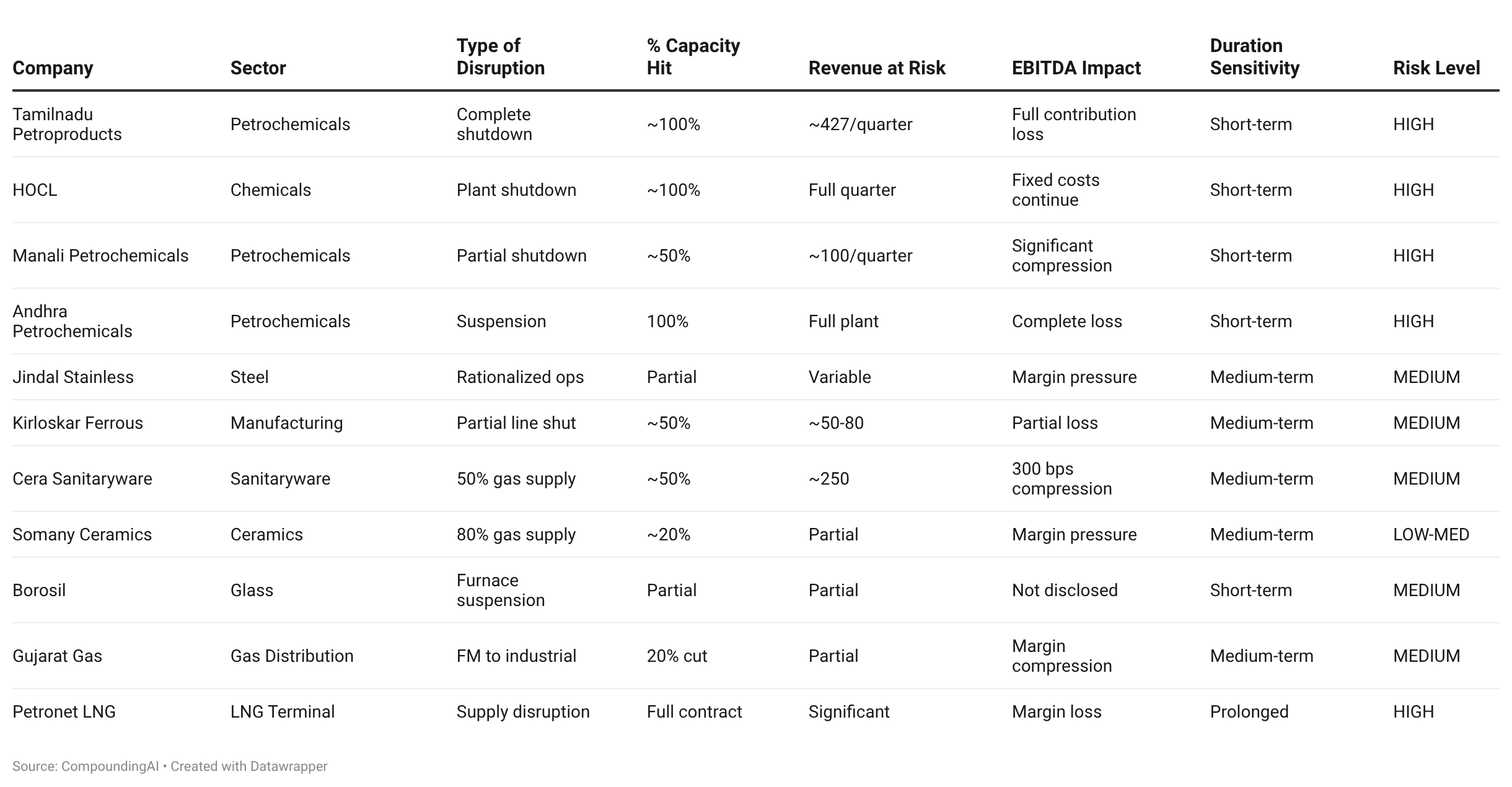 | Tamilnadu Petroproducts | Petrochemicals | Complete shutdown | \~100% | \~427/quarter | Full contribution loss | Short-term | HIGH |