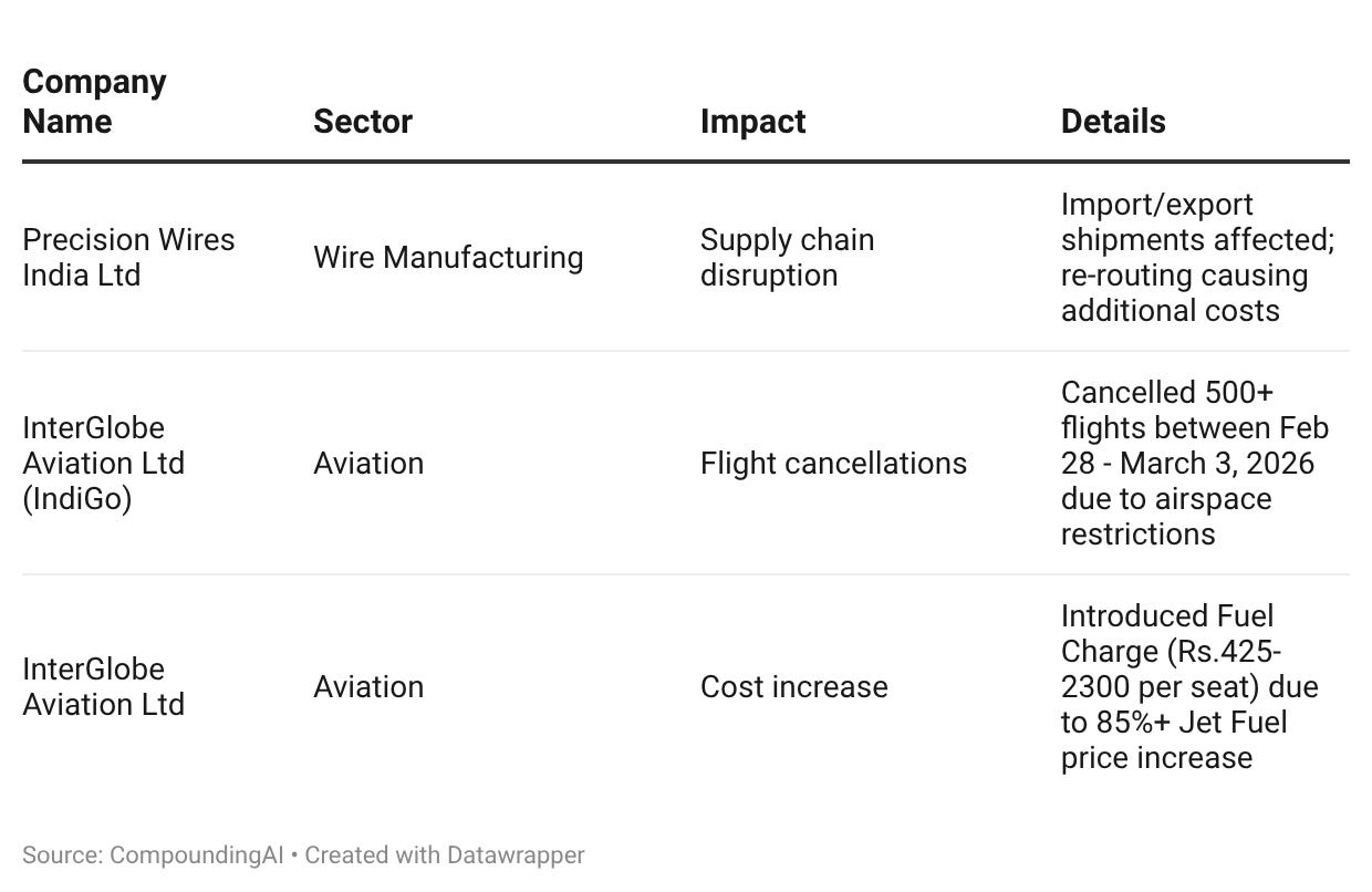 | InterGlobe Aviation Ltd (IndiGo) | Aviation | Flight cancellations | Cancelled 500+ flights between Feb 28 - March 3, 2026 due to airspace restrictions |