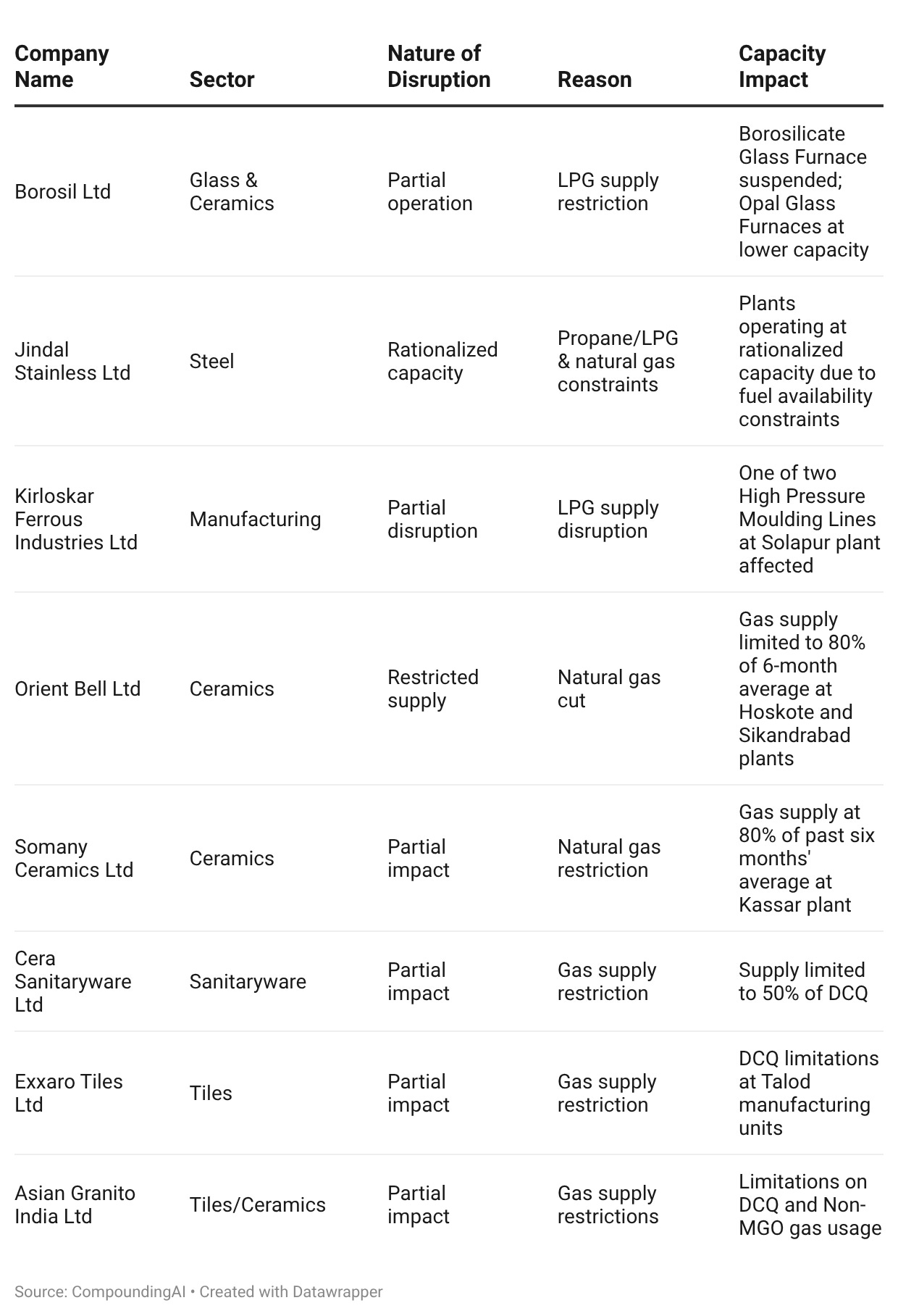 | Asian Granito India Ltd | Tiles/Ceramics | Partial impact | Gas supply restrictions | Limitations on DCQ and Non-MGO gas usage |