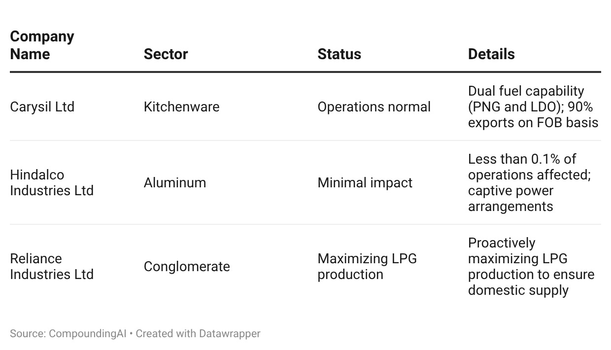 Finally, three companies filed disclosures that described minimal or no material impact. Carysil’s dual-fuel capability, PNG and LDO, insulated its manufacturing operations, and 90% of its exports are on FOB terms, limiting freight exposure. Hindalco reported less than 0.1% of operations affected, aided by captive power arrangements.