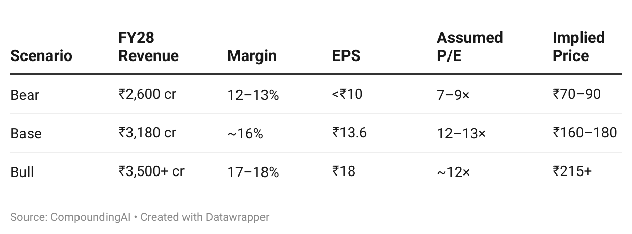 | Scenario | FY28 Revenue | Margin | EPS | Valuation Range |