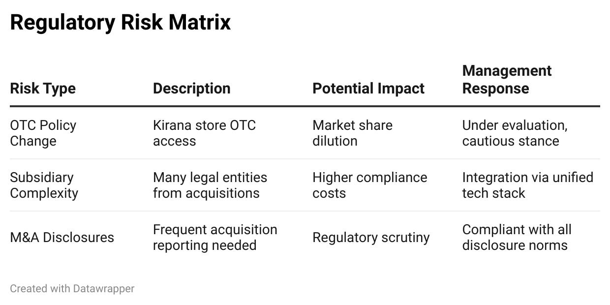 | OTC Policy Change | Kirana store OTC access | Market share dilution | Under evaluation, cautious stance |