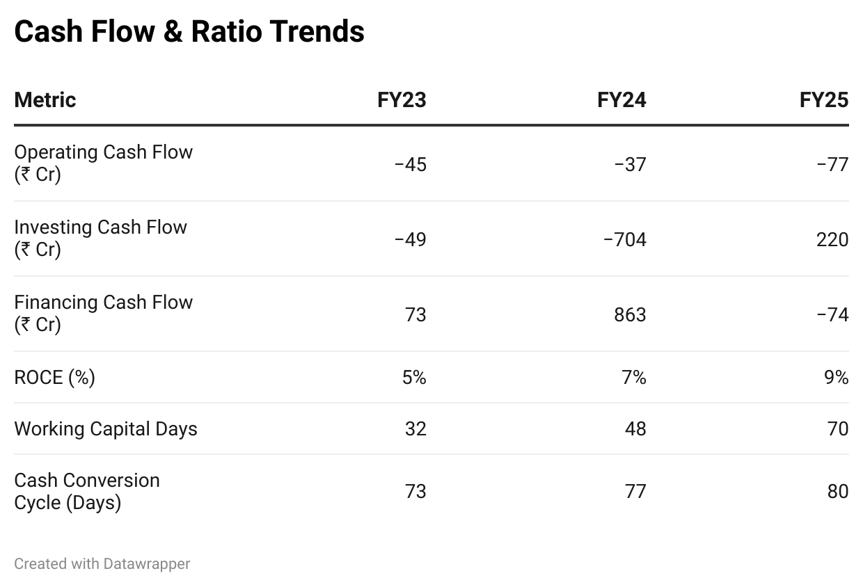 | Operating Cash Flow (₹ Cr) | -45 | -37 | -77 |