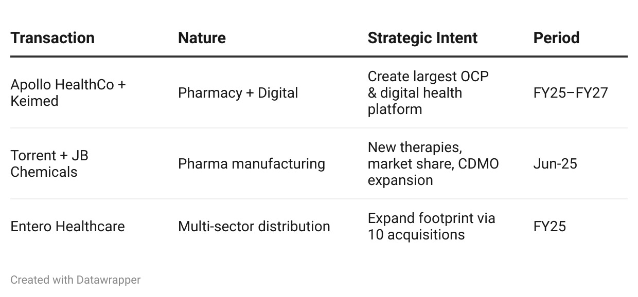 | Apollo HealthCo + Keimed | Pharmacy + Digital | Create largest OCP & digital health platform | FY25–FY27 |