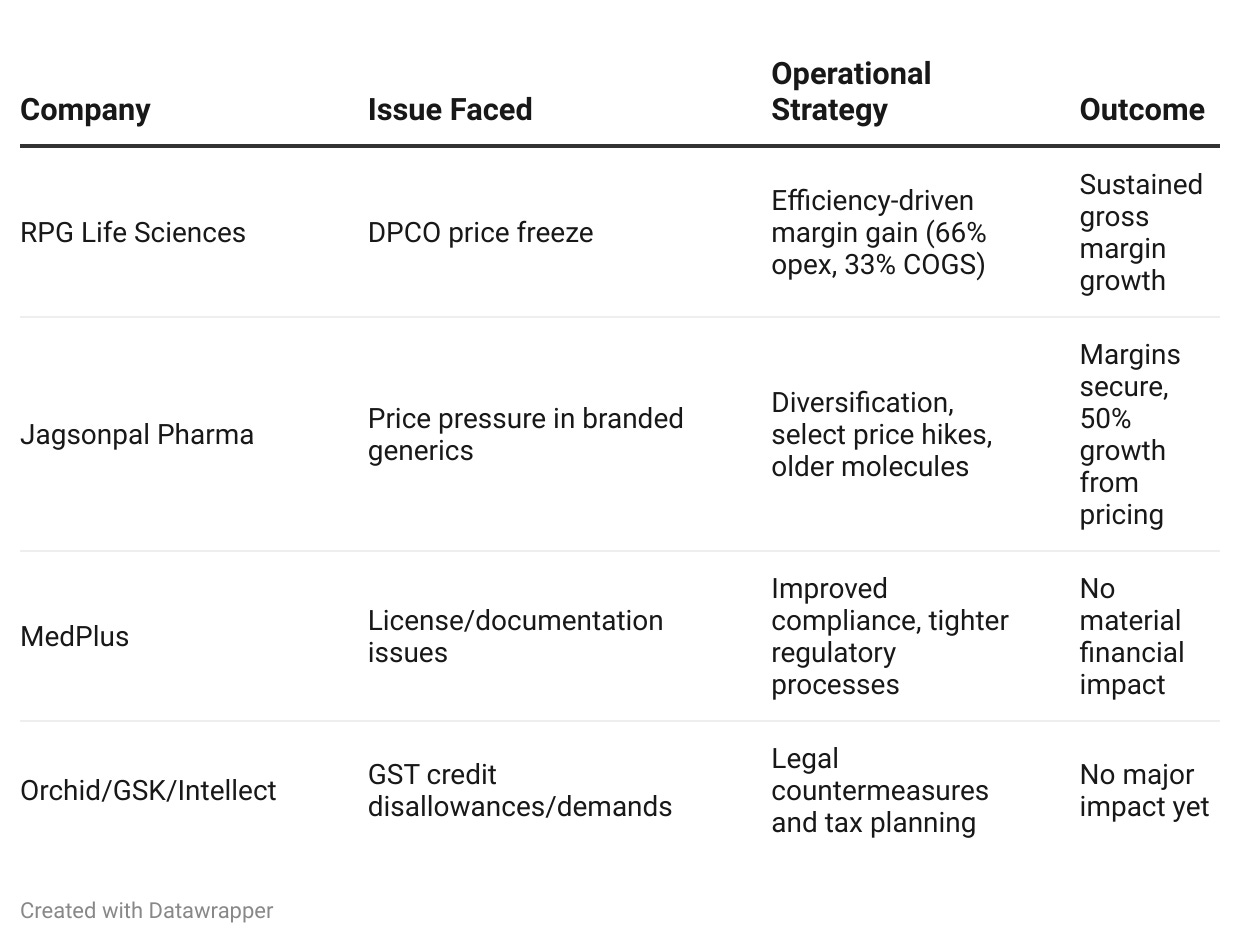 | RPG Life Sciences | DPCO price freeze | Efficiency-driven margin gain (66% opex, 33% COGS) | Sustained gross margin growth |