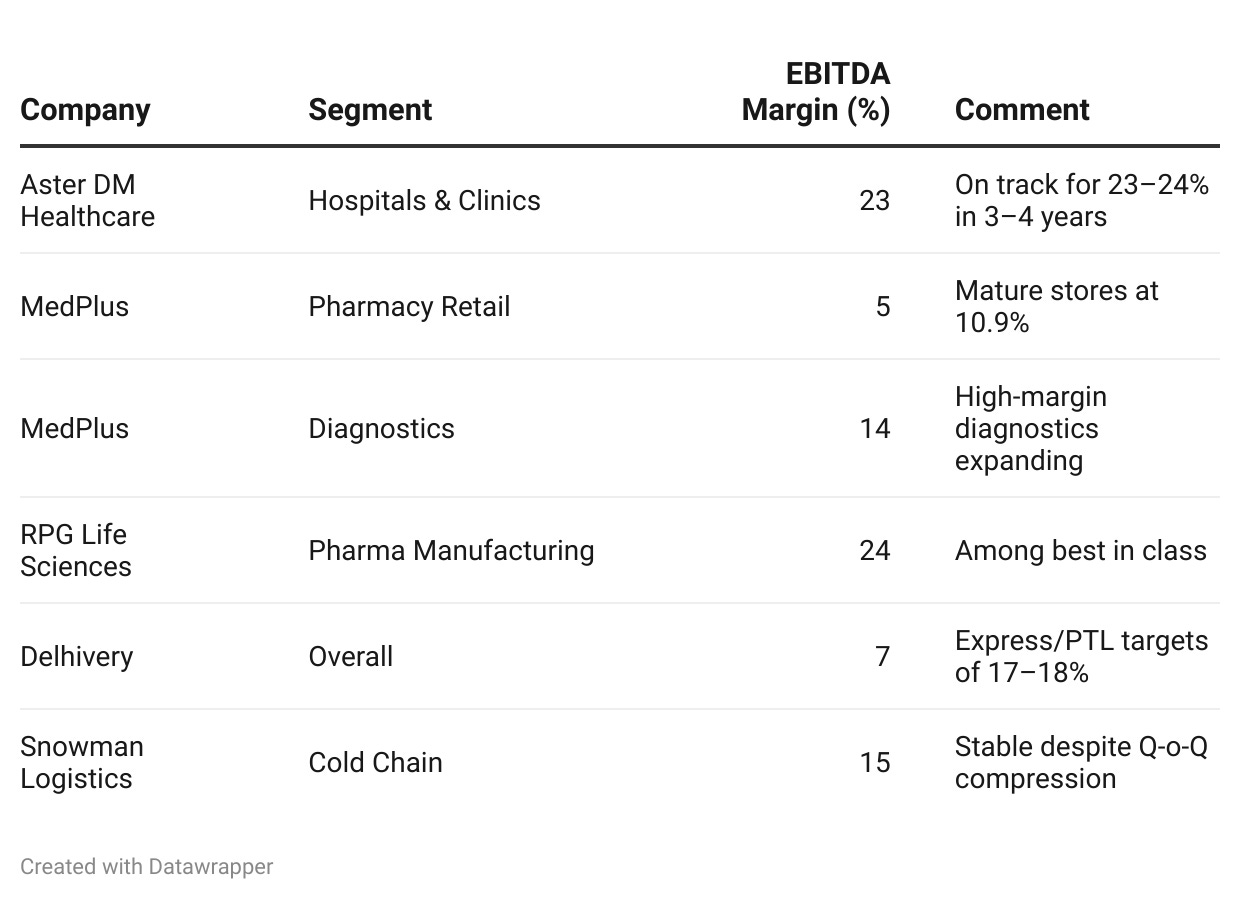 The margin architecture of the sector is shaped by business type. While pharmacy retail margins remain modest, diagnostics, hospitals, logistics, and pharma manufacturing enjoy higher EBITDA spreads.