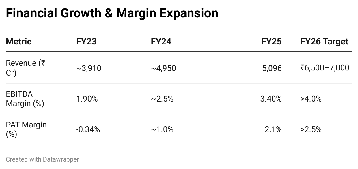 | Revenue (₹ Cr) | \~3,910 | \~4,950 | 5,095.80 | ₹6,500–7,000 |