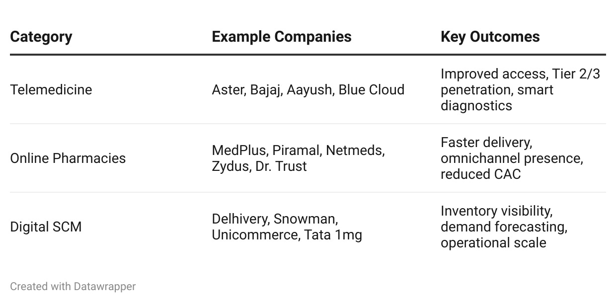 | Digital SCM | Delhivery, Snowman, Unicommerce, Tata 1mg | Inventory visibility, demand forecasting, operational scale |