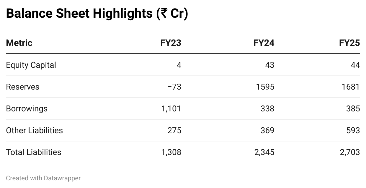 The IPO-funded equity base and profits have significantly boosted net worth. Moderate debt increase in FY25 supports M\&A and CapEx without straining leverage.