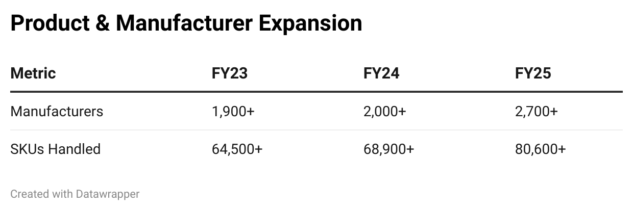 A 42% increase in SKU count and 800+ new manufacturers in two years indicates strong onboarding capabilities and high trust among suppliers.
